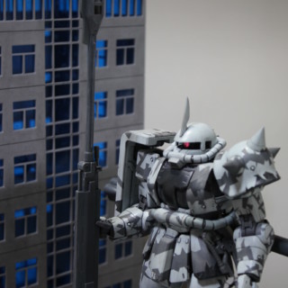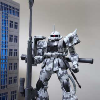 組み立て済みのシャア専用ザクVer2.0のキットがあったので、これで参加しました。とは言え、素組ではアレなので、「ヨーロッパ戦線で仕様されたスナイパー仕様のザク」という設定にして、カラーリングを「スプリッター迷彩」で塗り分けました。