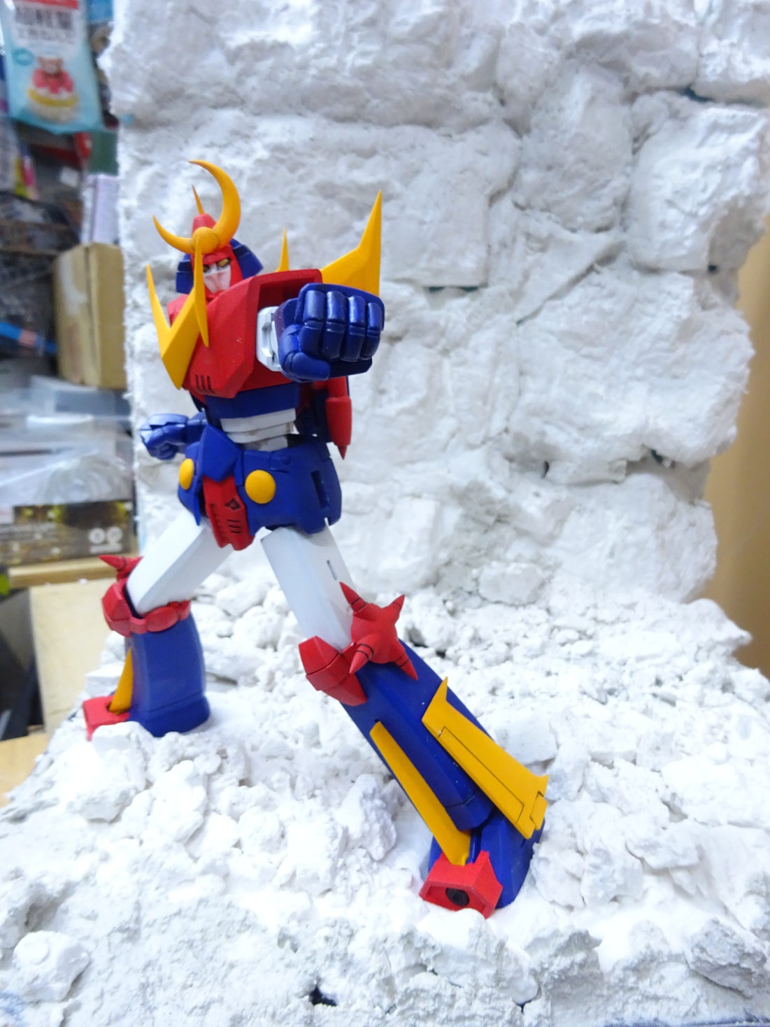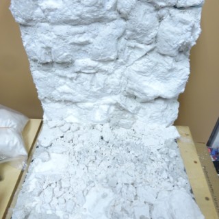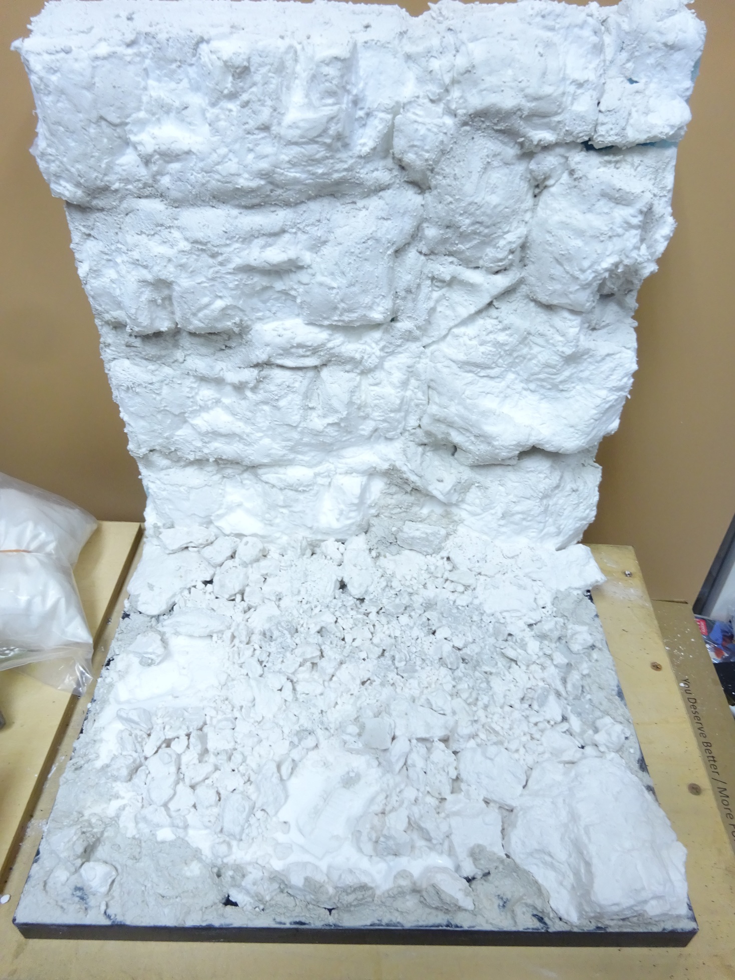 ベースはスタイロフォームで字のベースを作り、地面は石膏肩の岩、石膏を砕いたものを水溶き木工ボンドで固め、背景の岩は岩の石膏型に百均の軽量粘土を薄く延ばして型取りベースの軽量化を図りました。
