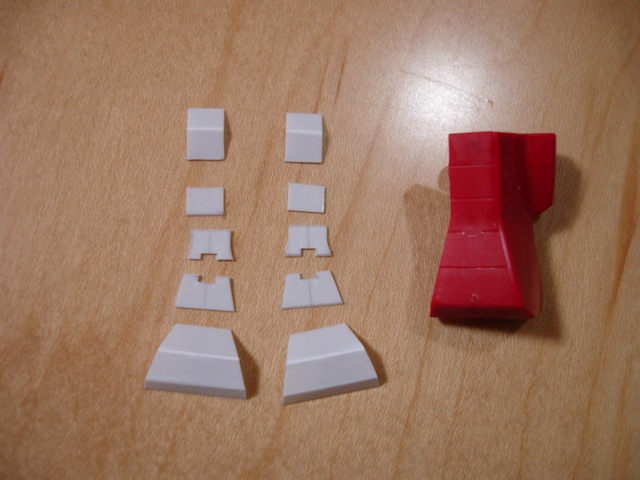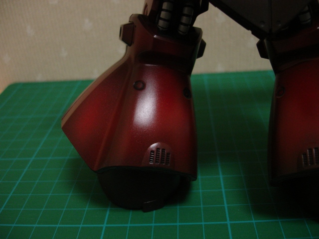 ■ 塗装 全てのパーツの下準備を終えて、ようやく塗装です。 まずは関節からですが、完成写真を見ると、肘の関節、動力パイプなどが全て指と同じ色になってます。なワケないでしょ・・・と塗り分けましたが、これらは一体成形になっているんで、結構大変です。 フレームと関節、内部のメカ類はベースグレーの塗りっぱなしでごまかすことにして、パイプ類はキチンと塗り分けます。 グレーの部分はMAX塗りです。ベースグレーを吹いて、色を乗せていきます。 ![]() ■ さらに一工夫 〜SGK〜 順調にいくかと思いきやまたまた問題が。 MAX塗りはホワイト、ライトグレーみたいな隠ぺい力の低い色や彩度の低い色をベースグレーに乗せるとキレイなんですが、逆に隠ぺい力、彩度の高い色の場合はなかなかいいカンジにいきません。メインカラーのレッドを吹いたときもやはりそうで、どうやっても赤というより茶色になってしまいます。こういう場合、サフに直接色を乗せて、シャドーを吹くんでしょうが、なんかいい方法はないかなぁと考えました。(シャドーの色を作るのが面倒だった) で、思いついたのが、ベースグレーをシャドーを吹くべき部分にのみ吹き、下地をグラデーションにしてしまおう、という方法。試しにやってみると・・・、なかなかです!