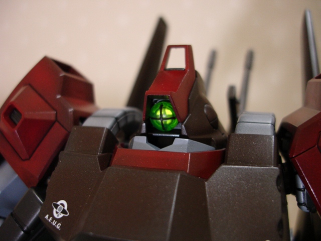 この方法なら、エッジ部分はより自然に、赤い部分はより鮮明に、吹き加減の調節も簡単にできます。これはいいっ!「SGK」(下地からグラデーション攻撃)と名づけよう!! すでに誰かやってたりして・・・。まあいいや。新技の発見に感動しつつ、ブラウン、レッドの部分はすべてこの方法で塗装しました。 モビルスーツって設計図のとおりのカラーだとどうしてもオモチャみたいに見えるんで、メインの赤は、モンザレッドにレッドを足して、ブラックではなく、メタルブラックを混ぜてみました。 多少重量感がでてると思います。 ■ 仕上げ 塗装ができたらデカールを貼りますが、このドライデカールってのはホントにやっかいですね。 面に付かないわ台紙から剥がれないわで、イライラしっぱなし。大まかな所にだけ貼って、終了です。シールは無いほうがいいかな、と思い、貼ってません。 デカールを貼ったら、トップコート。クリアに少しフラットベースを混ぜて、全体に吹きます。 そしてスミ入れして、全体のチェック。各パーツの色味のバラつきなどを調整して完成です。 ![]() ■ オマケ モノアイのレンズを取り付ける部分に、銀の シールをパンチプライヤーで抜いたモノを貼ってあります。こうすることで、奥行きが出るのと、ライトが当たるとなんとな〜く光ります。 ![]() ■ 完成 どうにか締め切りに間に合いました。デカいですよね〜。初めにも書きましたが、最近のガンプラってホントにすごいですよ!スナップフィットも賛否両論あるようですが、これもアリかな、と思います。あの「パチン!」はクセになりそうです。 エアブラシもだいぶ慣れて、もう筆を使うのと同じ感覚で使えます。塗料の濃さと、エア圧がキ モですね! さて、次回作なんですが、Ζ系をもう一丁!といきたいとこなんですが、ボトムズのブックレットに向けて製作中のマーシィをやっつけないといけないので、まずはそっちを仕上げます。余力があれば、1/100でなんかつくりたいですね。ガルバルディとか・・・。 では!!! |