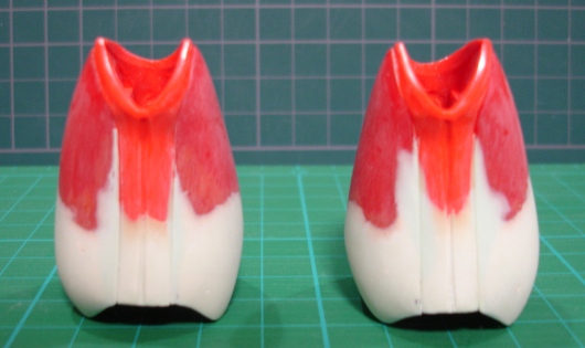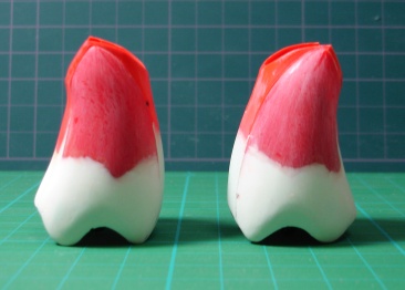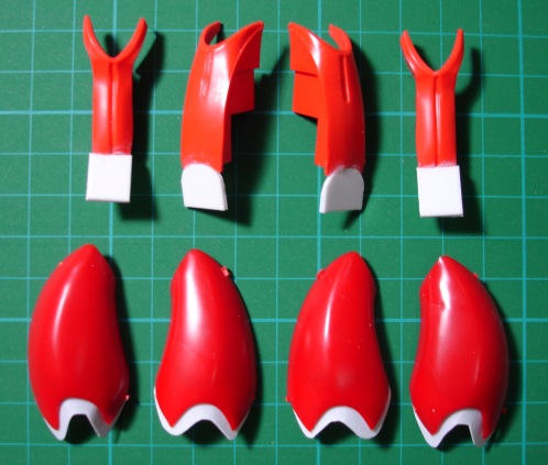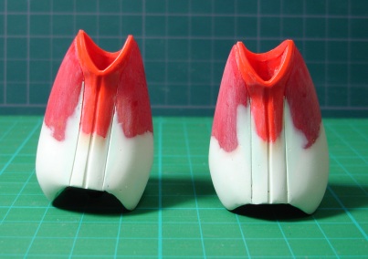 前後にも左右にも。特に前(裾口近辺)が気になります。甲が出すぎですもんね。 というわけで改造です。 この部分は、切断して延長ではなく、各パーツの下をプラバンとポリパテで延長しながら成形していく方法をとりました。