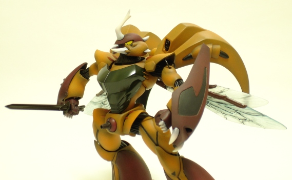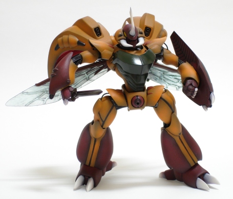 作った印象だと足の事ばっかり思い浮かびますが、こうして記事を書いてると、ほとんど全身何かしらいじってたんですねぇ。 ■ 塗装 すべての工作が終わってようやく塗装です。 まずはサフを吹くんですが、今回はプレーンな面と梨地面を作りました。オレンジの部分はプレーンに1000番のサフを吹きます。赤い部分は500番のサフをかなり離して吹きデコボコが残るようにしてあります。 牙と爪はホワイトサフを吹きます。 塗装はSGKで行いました。まず、エッジとモールド部分にベースグレーを吹き、その後色を乗せていきます。 説明書の完成写真を見ると、なんか石鹸みたいになってますので、カラーはオリジナルにしました。オレンジの部分はMr.カラーのオレンジにフラットベースを少量。赤い部分はレッドにハルレッド、ブラック、フラットベースを混ぜて作ってみました。トップコートで艶を消すのになぜここで各色にフラットベースを混ぜるのか?それは艶を少し抑えたほうがグラデーションの出具合が見やすくなるためです。これはぼくだけが感じることかもしれませんが、光沢カラーを吹くよりはずっとわかりやすいような気がします。 オーラバトラー独特のフォルムを強調するため、グラデーションは少し強めにしてみました。 牙、爪は、根元のほうにブラウンを吹き、そのさらに根元にベースグレーを吹いて、1段グラデーションを作った後、ホワイトにセールカラーを加えた象牙色を乗せました。 最後に牙、爪以外の部分に艶消しのトップコートを、牙、爪部分は半光沢のトップコートを吹き、エナメルのフラットブラックでスミ入れをして完了です。 嗚呼・・・。1番好きな塗装が終わりいよいよ制作もクライマックス。最後に大仕事が残ってます。 ■ 関節 今回、脚部の大幅な改造ともう1つ、メインとなる改造、それがこの関節部の自作です。 設定資料を見る限りでは、オーラバトラーの関節には無数のコードが詰まったようなカンジに描かれています。実際、HGのキットの関節はそういうモールドが入ったパーツになっています。それら関節パーツを本物のコードで作ってみようというわけです。名づけて「フレキシブル関節」! 例によって頭の中ではかなりいいカンジになってるんですが、どうなることやら・・・・。 ![]() 使った材料です。一番下のヤツはスジ状のモールドが入ったゴムチューブで、右上の3つ丸まってるのが10芯コードと呼ばれるリード線です。そしてグリーンのヤツがアルミ線です。 まず、芯となるチューブを適度な長さに切って、その回りに同じ長さに切ったリード線をくっつけて各パーツの穴にはまる太さにしていきます。と、言うのは簡単なんですが、つなぐ穴同士は大きさが違うので、短く切ったリード線を付けたりテープを巻いたりして調整します。これがまた手間がかかります。 肘関節のテストショット。 肘の関節は1番小さい関節なのでまずはここから作ってみました。 ゆるいと止まらないんでピッタリはまるように何度も調整します。 関節がきちっと止まるようになったらチューブにアルミ線を通します。 そのままだと曲がりませんが、アルミ線を通すことで関節を曲げたカタチにできるわけです。 ![]() こんな要領で肘、肩、股、ヒザの各関節を作っていきます。 首の関節はコードで自作はムリと判断し、キットのゴムパーツにしましたが、なんか色が薄いので、エナメルのフラットブラックで塗装して付けました。頭の中の関節受けはリューターで削っちゃってますから、胴体から出てるパイプ状のパーツにボールジョイントを差し込んで、エポキシパテを詰めた頭に突き刺しました。(こういうのを2度手間ってゆーんですよね・・・) ![]() これが全身のテストショット。関節部はちょっとしか見えませんがなかなかリアルに仕上がりました。 しかし、ここで大問題が・・・。 関節はきちっとはまったつもりでいても、いざ立たせてみると重みですぐ動いてしまいます。上の写真でも関節部はかなりゆるく、後ろに寄りかかってる状態でも3分立ってるのがやっとです。もちろん持ち上げることなどもできません。 最大のネックは股とヒザ。ここをなんとかしないとポーズどころか自立もできません。 ここから改善していきます。 キツくするのは簡単で、できている関節に細いリード線を1本ずつ差し込んでいけばいいんです。各関節の端の部分はコードがバラけていますから、細〜く切ったセロテープを巻いて束ねます。 ![]() ![]() ■ 完成 関節の補修が終わり完成です。なんとか自立はするようになったものの、各関節少し不安定です。ポーズをとらせるには曲がった状態の関節を作ったほうがいいかもしれません。(フレキシブルじゃないじゃん!) はっきり言ってこの関節は失敗でした。今にして思えば、後ハメ式の関節パーツを細くて強度のある素材で自作してその回りにコードを這わせるようにすればよかったと反省してます。コレは次回の(あるのか?)課題と