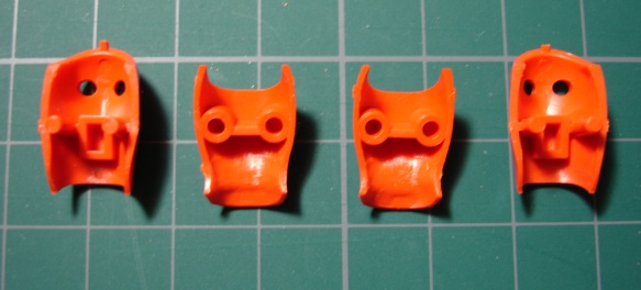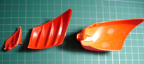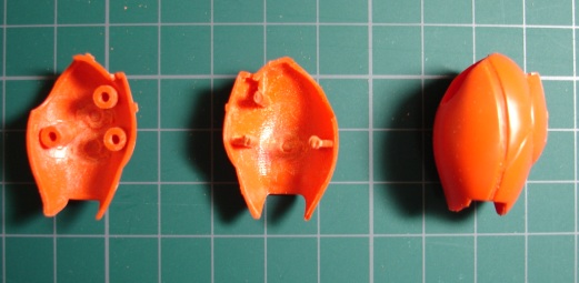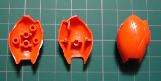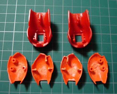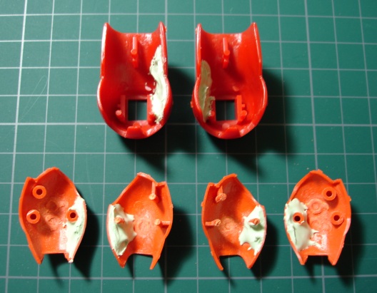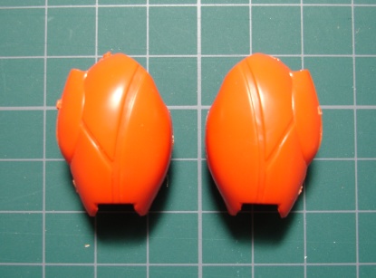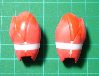 オレンジのパーツには1.2mmのプラ板を、赤いパーツには0.3mmのプラ板を使いました。オレンジのほうはパテを盛った後も付けたままにするので瞬着でしっかり接着し、赤のほうはパテ硬化後にはがしますので、点留めで軽く接着してあります。 そしてポリパテを盛り付けます。(写真右) 1日放置して成形作業に入ります。削りだしには平と半丸の棒ヤスリを使いました。 ![]() 削ってまた盛って削ってと、2回やったところ。 元のパーツと比べるとずいぶん延長されてるのがわかります。 この段階では細かい部分にこだわらないで、とにかくイメージするカタチになるまで繰り返します。 このキットでは脛の外側が開閉するようになってるんですが、合わせ目がピシっとしないので接着しました。 1つのパーツとしてみればバランスもよりとりやすくなります。 で、この状態ではまだまだボリュームが足りないのでさらにパテを盛り付けます。 こんなことを5,6回やったでしょうか。