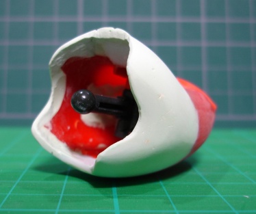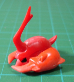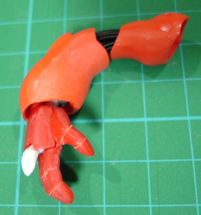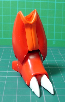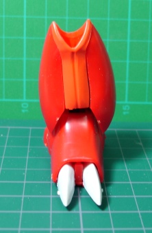 コンバータと口の中、それとほっぺにあるバルカンにも穴を開けました。 このキットに限ったことではないんでしょうが、全体的にモールドが浅く甘いので、ほとんどのモールドはケガキ針で彫りなおしてあります。 同様に指や牙、爪などもダルダルなので、シャープに削ってあります。 そして左の握り拳は剣を挿す穴が開いているのでエポキシパテで埋めて指のモールドを彫ってあります。 そして最後はコンバータ。