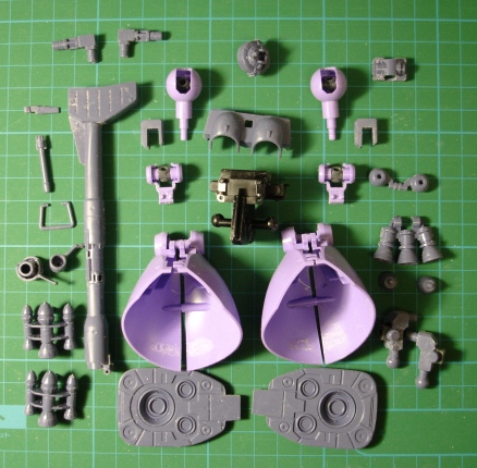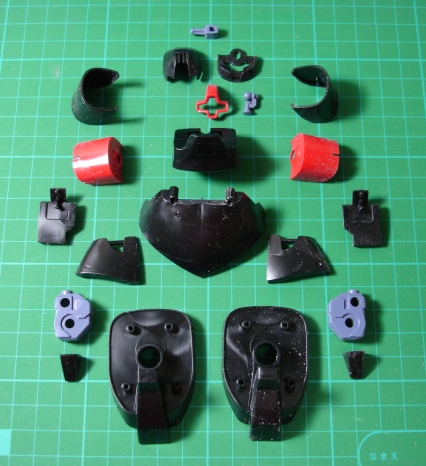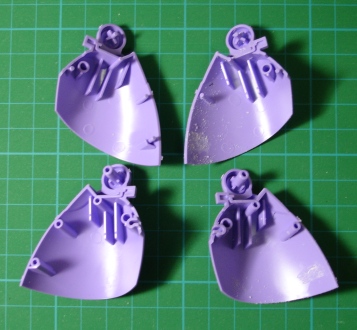 この角度で見ることはあまりないかもしれませんが、数少ない気になる部分なので、この部分はリューターで削り落としてしまいます。 右の写真は、左側の二つが加工前、右側の二つが加工後です。これで、バーニア周りがすっきりしました。 パーツをどんどん切り出してゲート跡とパーティングラインの処理をしていきます。いつものごとく、ゲートはデリケートな部分に付いてるのがありますので注意ですね。