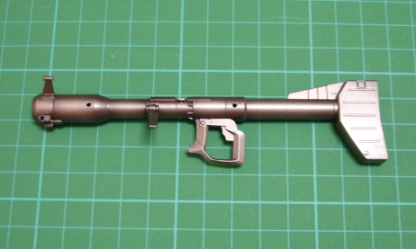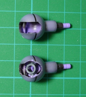 さすがファーストのMS。パーツの数が少ないっ! この作業で見つけたモールドが甘いところはケガキ針で彫り直しておきます。 バズーカの丸いモールドは、そのままドリルで穴を空けました。 ![]() ■塗装 設計図の完成写真を見ると、なんだかアニメチックで軽そうな感じです。 ドムといえば「重」モビルスーツですので、重量感のあるカラーリングにしたいところです。 まずは内側の見える部分から。 ドムと言えば裏側が赤!ですから、見える部分は全て赤(裏側用に調合してある)で塗っておきます。 後で表面にサフを吹いたり塗装した時に汚れますが、それは「味」になるので、マスキングなどはしないでおきます。 ![]() バズーカは、サフ後にベースグレーを吹いて焼鉄色をグラデーションをかけながら乗せてみました。 実弾兵器なので、焼けたり煤けたりした感じを表現したかったんですが、なかなかいい感じになったと思います。 ![]() そして本体のカラーレシピは・・・ 紫の部分は、パープルに明灰白色とホワイト、シルバーを加え、ブラックで調整しました。彩度を落として兵器感を出しつつ、パープルの色味は残す感じです。 胸部のグレーは、ベースグレーにベースグレー3(白い機体の下地用に作った明るいベースグレー)を乗せたんですが、隠ぺい力が強すぎて少し吹いただけでエッジまで全部隠れてしまい、ベタ塗り状態になっちゃいました。 そこで、ベースグレーを細吹きにしてシャドウをかけてみました。 黒い部分は、ベースグレーの上にメタルブラックを吹いたんですが、シルバーの粒子が思いっきり目立ち、見た目はほぼグレー。こりゃいかん。どうみても失敗です。塗り直そうとした時、ふと思いつきました。通常よりもかなり薄めた黒でシャドウをかけたらどうなるんだろう? 試しにやってみるとこれがまたいいカンジ!色味はもちろん、中央に残ったシルバーの粒子がハイライトになって絶妙な表面感になりました。黒い部分のグラデーションはどうしようか悩んでましたがこれで一気に解決です。 まさに「怪我の功名」ってヤツですね。 そして胸のところにデカールを貼って半光沢のトップコートを吹いてほぼ塗装は完了です。 ■最後の最後で・・・ ヒート剣、バーニアノズルの塗装も終えて、いよいよ各パーツをパチパチ組んでさぁできあがり・・・ あれ?なんだこりゃ! 胸に貼ってコートした「07」のデカールに大きなキズが・・・。 ショック!放置するにはあまりに目立つキズでした。アタマが真っ白になって写真撮るのも忘れたくらいです。 なんで・・・?なんて考えても始まりませんから、下の塗面ごとペーパーで削り落としました。 ![]() 「せっかくキレイにできたのに〜」(涙) コイツのリカバリーは大変でした。周囲をマスキングしてサフからやり直しです。ベースグレー→ベースグレー3→ベースグレーシャドウと重ねて、マスキングテープを剥がすと見事な段差になっています。この段差を1200番のペーパーでならし、色がハゲた部分はベースグレーのドライブラシでリタッチ。 そして再びデカールを貼ってトップコートをたっぷり吹きました。 これでなんとかリカバリーできましたが、1時間もタイムロスです。 これでようやく完成かと思いきや、さらなる悲劇が・・・。 あ、あれ?肩がハマらない・・・! 肩パーツに仕込むポリキャップを間違えました・・・。 「だから仮組みしろって言ったじゃん!!!」 もう下半身は見事に完成しているその横で・・・。 アタマが真っ白になって写真撮るのもわすれたくらいです。(2回目) この肩パーツは接着して合わせ目消しをしてあるパーツなので、割った場合最低でも完成は2日後になってしまいます。ここまできてそりゃないでしょう。 ・・・何とかならないか、と考えてひらめいた! スコープドッグの肩のアーマーを後ハメに加工するのと一緒じゃん! 早速中のポリキャップをナイフで切断して取り出し、ポリキャップの取り付け穴のふちを入り口ごとリューターで削ります。 で、ポリキャップの軸を斜めにカットして、ピンセットの柄で押し込むと・・・ パチン、と音がして見事に成功! ![]() 写真の上は間違えたポリキャップを取り出したところで、下は加工後です。 多少見栄えは悪いんですが、まったく見えない部分なので一安心。 これをもう1つやってなんとかリカバリー終了。 ここでは1時間半ロスしました。 ■完成!